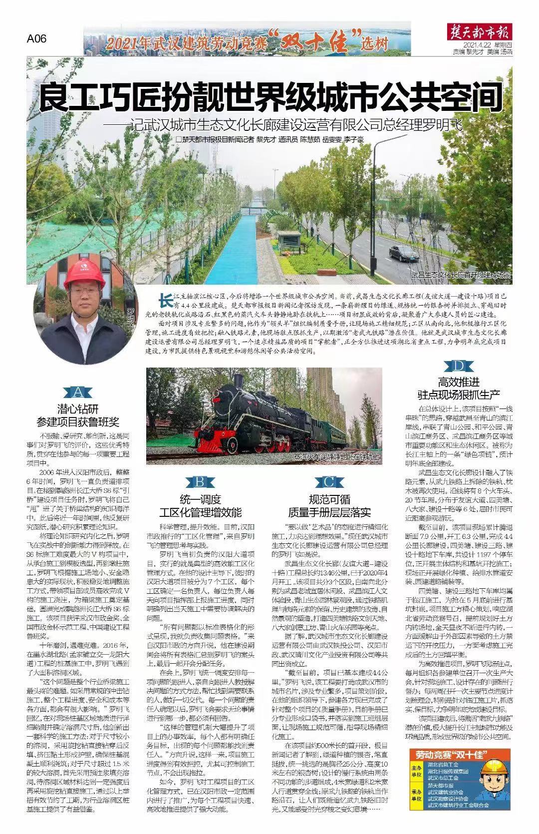 楚天都市報:良工巧匠扮靚世界級城市公共空間——記武漢城市生態文化長廊建設運營有限公司總經理羅明飛